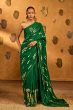 Details: The saree is a half-and-half design, featuring a beautiful placement foil print on the pleats and an all-over foil print on the crushed pallu. Blouse Piece - The blouse piece features beautiful embroidery at the center, adding an elegant touch to the design.